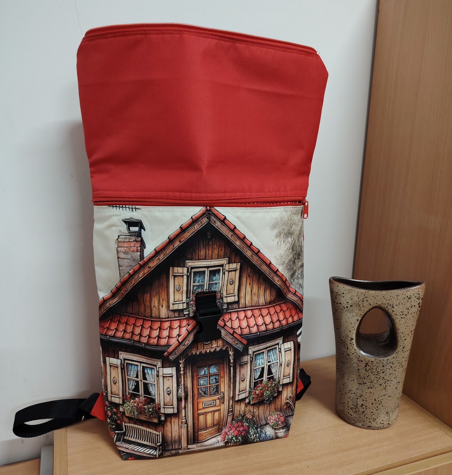 Materiál kočárkovina, rozměr šířka 38cm, výška 40cm + 10cm překlopení. Dvě velké oddělené kapsy, každá zavírání na zip. Nastavitelné popruhy.