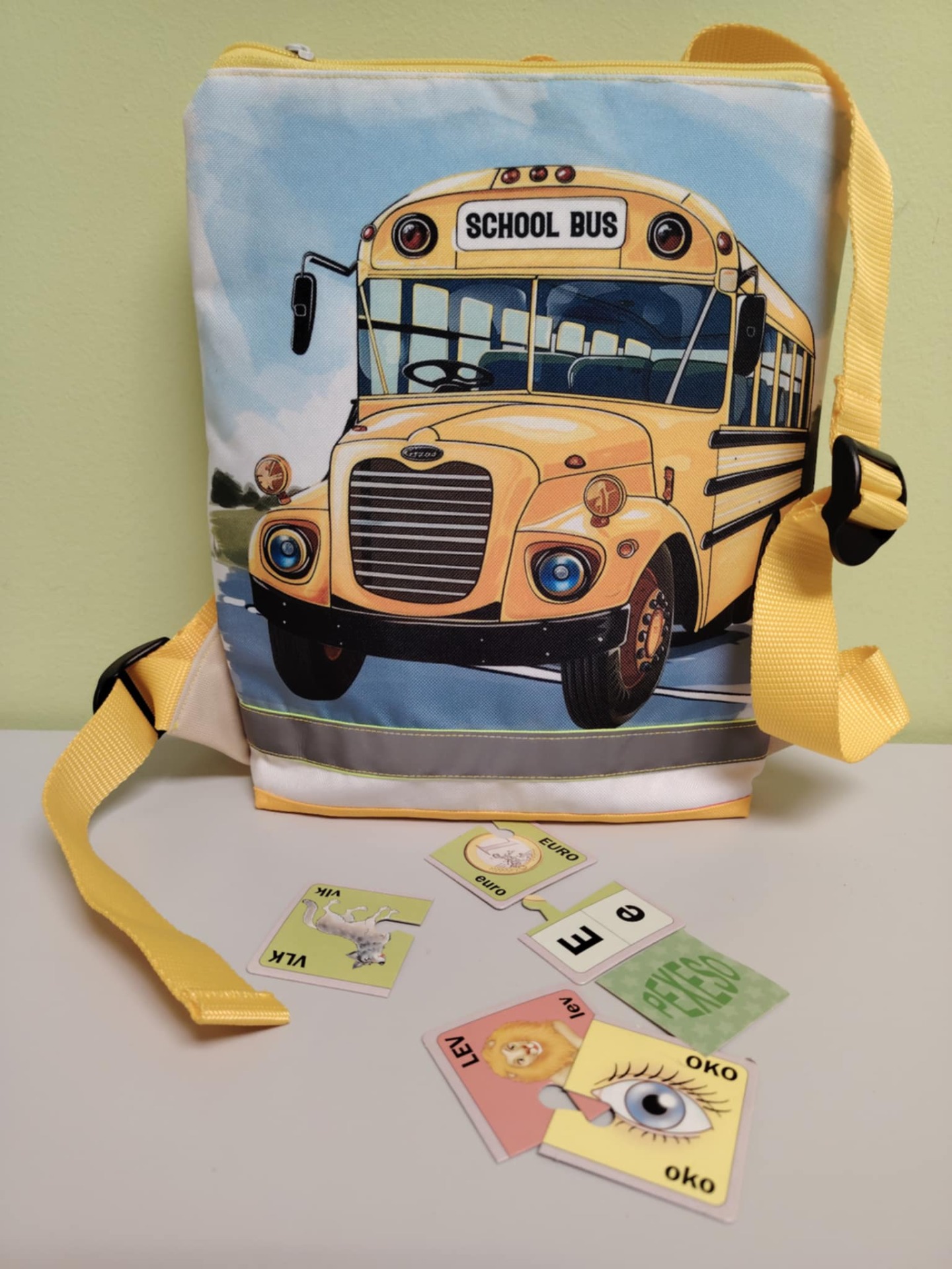 Dětský batůžek, materiál kočárkovina. Rozměr 27x30cm. Na přední části batohu bezpečnostní pruh. Nastavitelné popruhy.