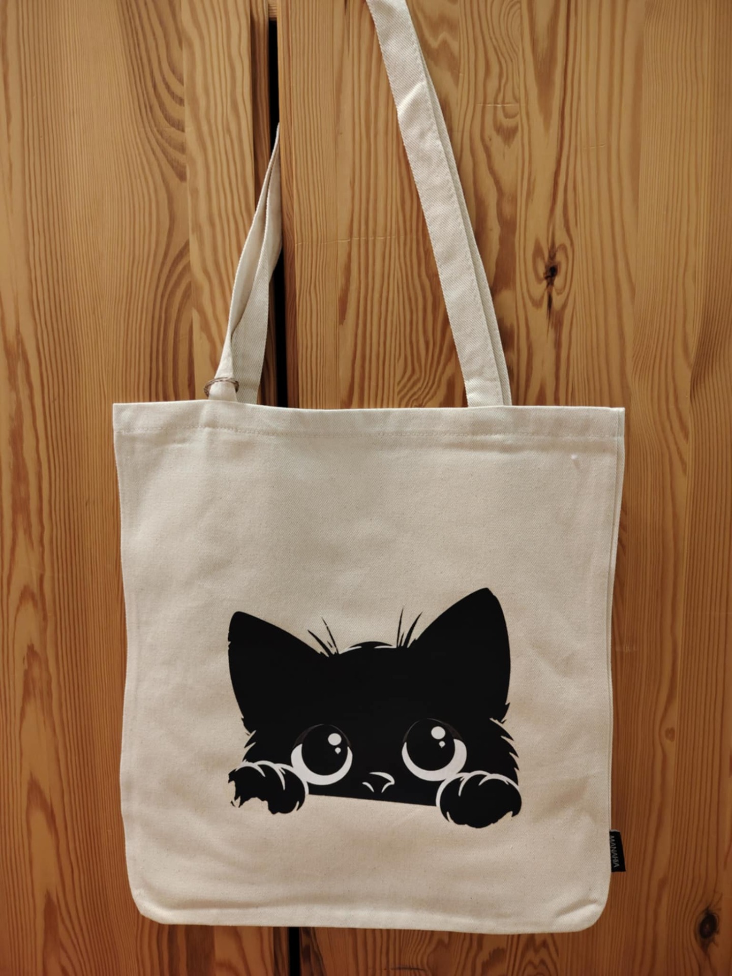 Pevné,hrubší plátno, rozměr 38x41cm, ucho 64cm. Prát otočené obrázkem dovnitř, lze přežehlit z rubu v části obrázku.