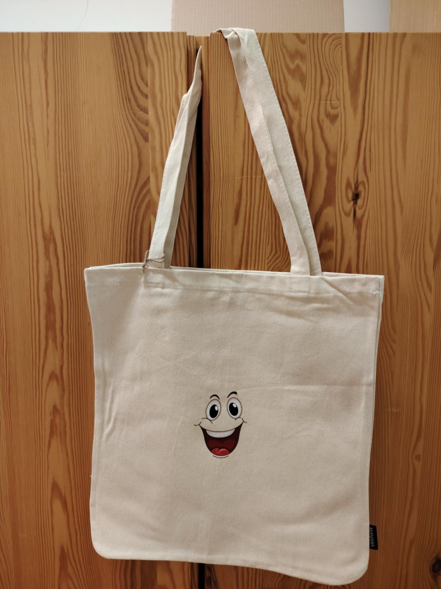 Pevné,hrubší plátno, rozměr 38x41cm, ucho 64cm. Prát otočené obrázkem dovnitř, lze přežehlit z rubu v části obrázku.