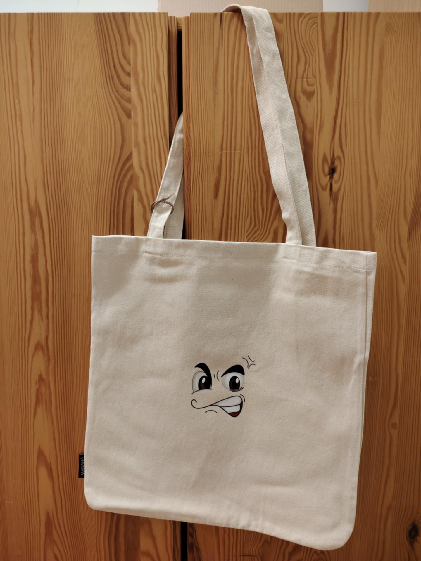Pevné,hrubší plátno, rozměr 38x41cm, ucho 64cm. Prát otočené obrázkem dovnitř, lze přežehlit z rubu v části obrázku.